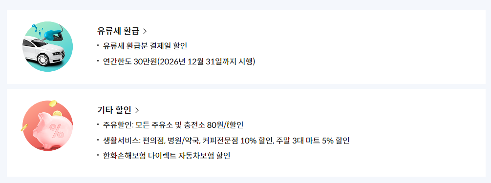 - 혜택: 주유 할인, 편의점, 병원/약국, 커피전문점 10%할인, 주말 3대 마트 5% 할인, 한화손해보험 자동차보험 할인