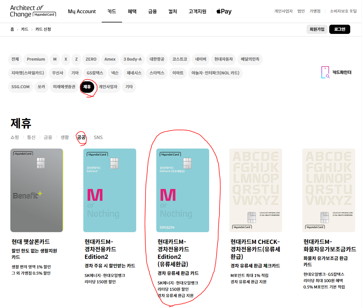 - 현대카드 홈페이지 접속 → 카드 → 카드신청 → 제휴카드 → 공공 → 현대카드M-경차전용카드 Edition2(유류세환급)