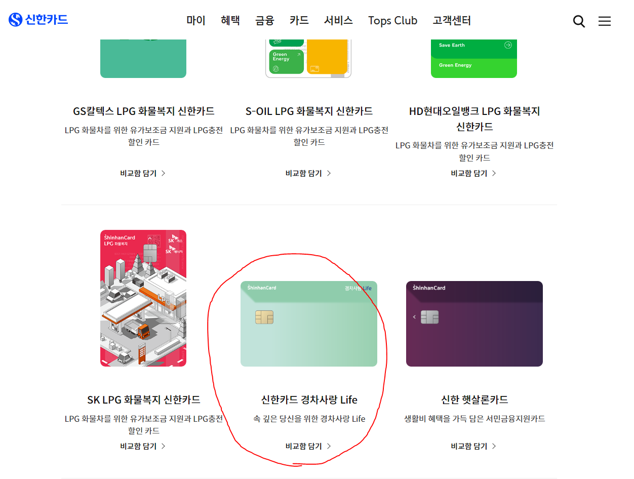- 신한카드 홈페이지 접속 → 카드 → 신용카드 → 공공/단체 → 신한카드경차사랑Life