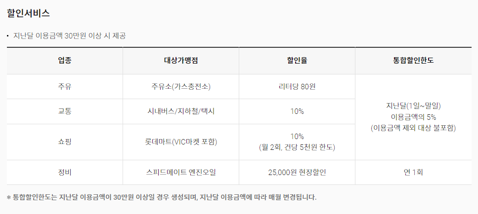 - 혜택: 주유 할인, 대중교통(버스, 지하철, 택시)할인, 롯데마트 할인, 정비 할인 등의 혜택