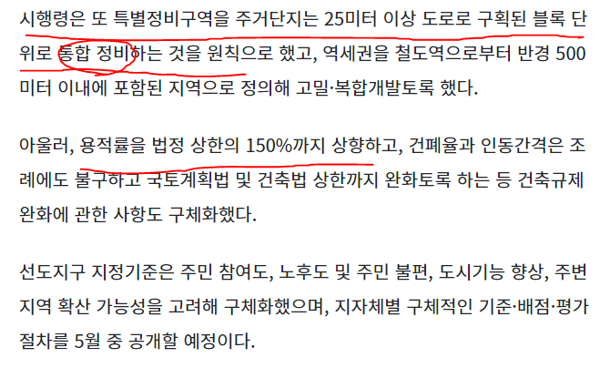 노후계획도시정비특별법 시행령에서 노후계획도시의 정의 및 특별정비구역 기준을 정했습니다. 또한 용적률을 법정 상한의 150%까지 상향하고 조례에서 정의한 건폐율과 인동간격을 완화했습니다.