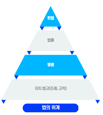헌법이 가장 상위법이고, 법률, 명령, 자치 법규(조례, 규칙) 순으로 위계가 내려갑니다.