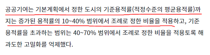 공공기여의 비율은 기준 용적률까지는 10~40% 범위 내에서 조례에서 정한 비율을 적용하고, 기준용적률 초과분에 대해서는 40~70% 범위 내에서 조례에서 정한 비율을 적용하여 과도한 고밀화를 억제했습니다.