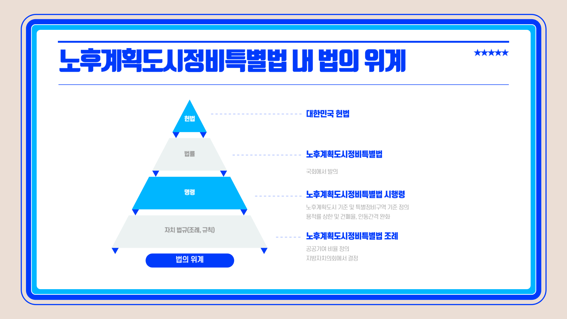 간단하게 정리를 해보니 노후계획도시정비특별법 보도자료에 포함된 법의 위계가 한 눈에 보이는 것 같습니다!
