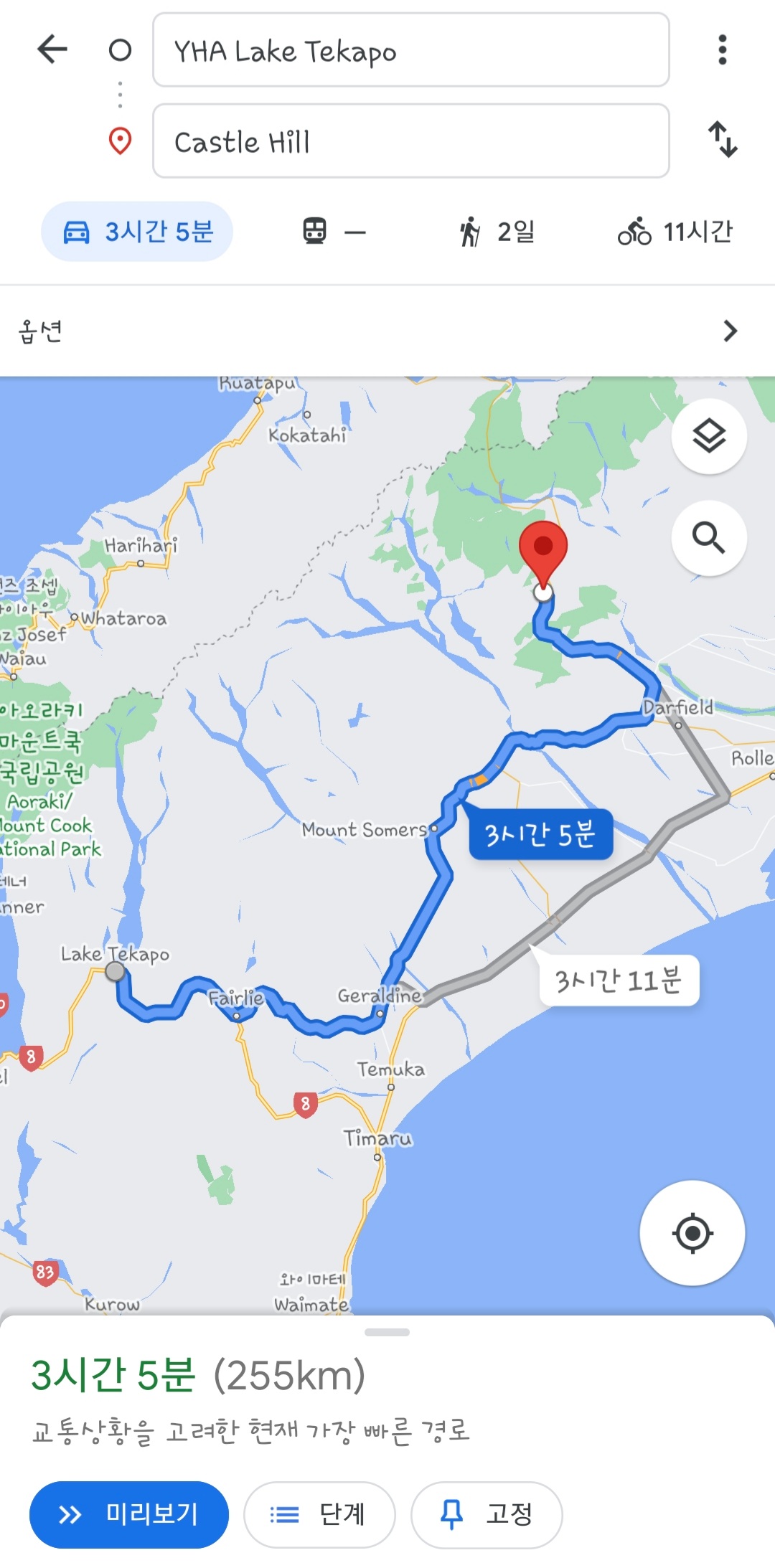 테카포호수 숙소에서 캐슬힐까지는 약 255km 거리로 3시간 5분이라는 이동시간이 찍혔습니다. 한국에서의 3시간 운전은 너무 힘들지만 뉴질랜드 도로는 매번 풍경이 바뀌고 차도 거의 막히지 않으면서 체감 상 한국보다 절반도 안힘들었습니다!