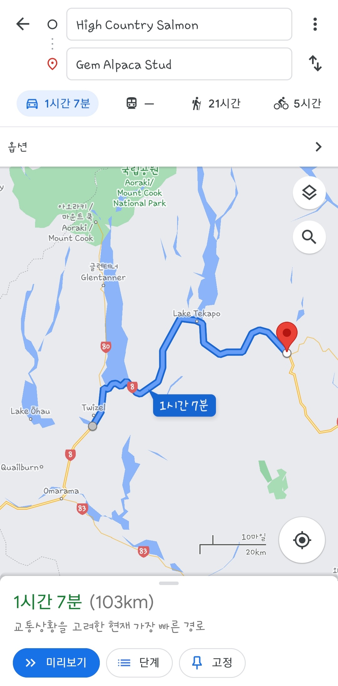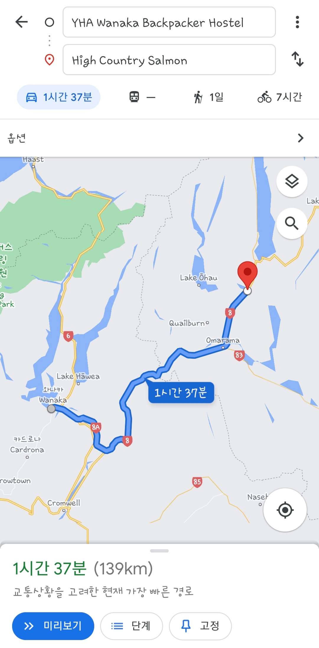 하지만 8일차 일정이 프란츠조셉 빙하에서 와나카로 변경되면서 자연스럽게 다음 일정도 변경이 되어야했는데 달은 조금 밝을 수 있지만 밤하늘의 별을 못 본 아쉬움을 해소하고자 9일차 일정을 다시 한 번 테카포호수에서 머무는 것으로 변경했습니다. 와나카숙소에서 테카포호수로 가는 길에 유명한 High country salmon 연어양식장이 있다고해서 식사도 할 겸 방문하기로 하고 이동을 시작했습니다.