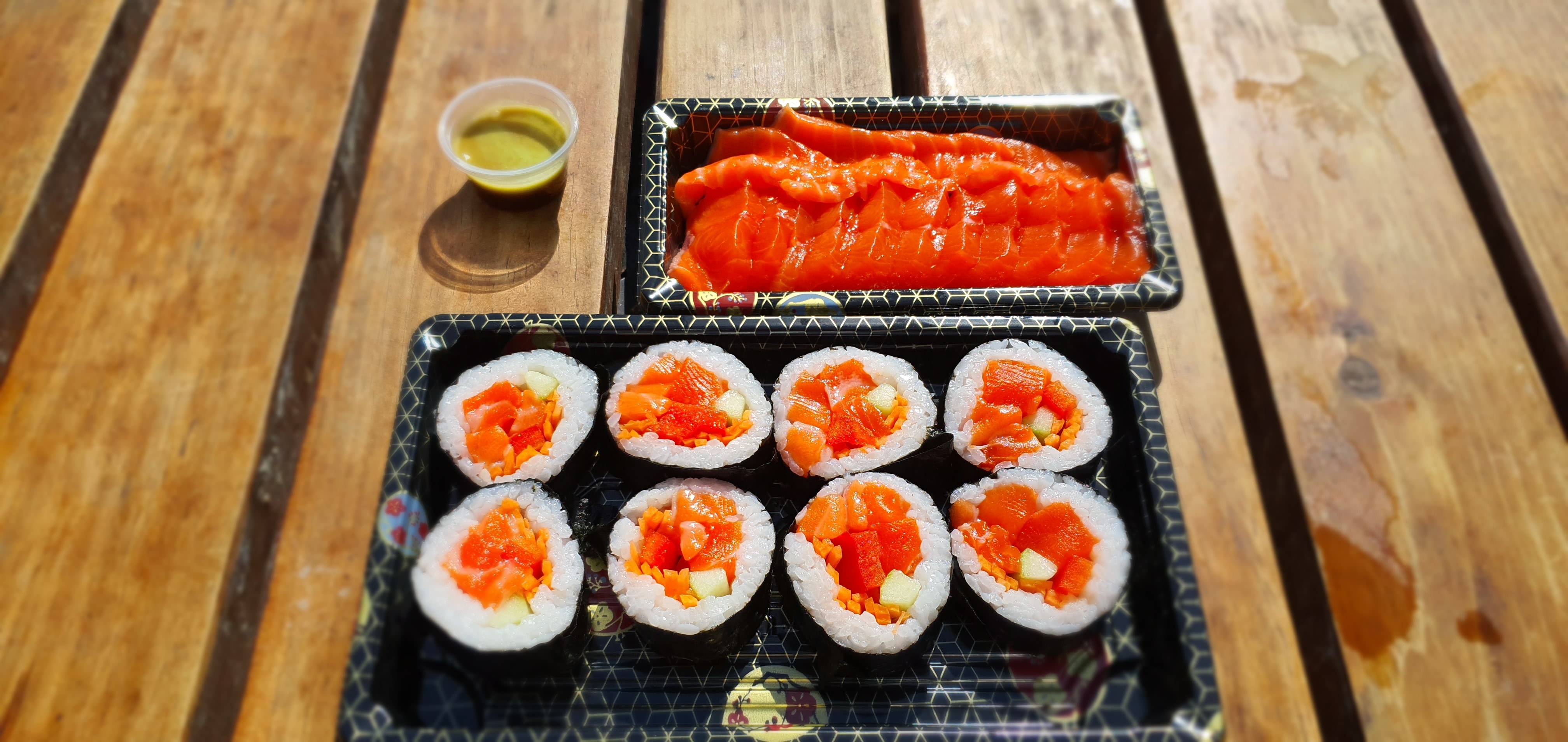 저는 아점으로 간단하게 연어 사시미 작은것과 롤, 그리고 따뜻한 커피를 한 잔 주문 한 뒤 양식장 바로 옆에있는 야외 테이블로 이동해서 자리를 잡았습니다.