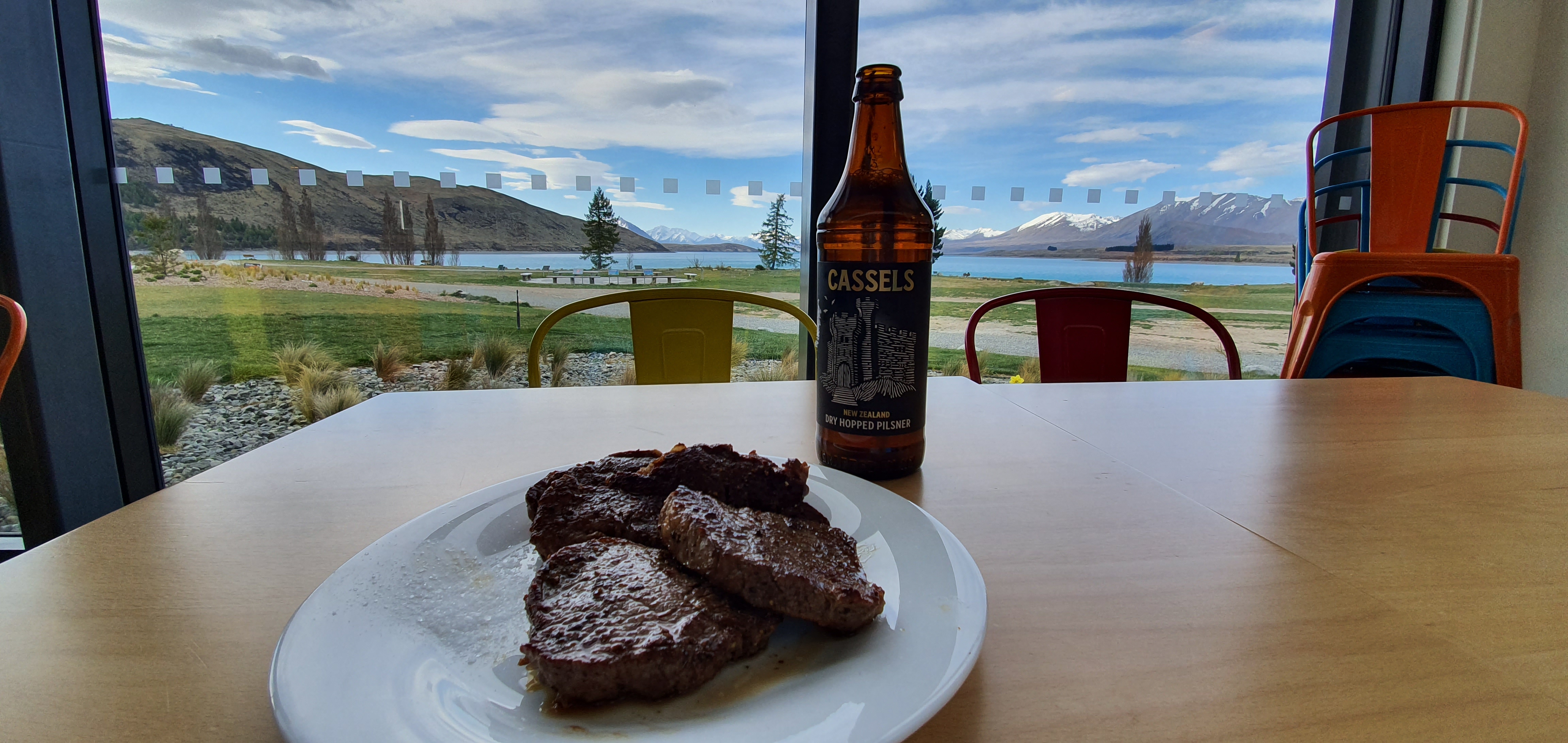 배가 많이 고팠는지 짐을 풀자마자 바로 주방으로 이동해서 고기를 구웠습니다. 시설들이 대부분 최신이라 주방도구들도 상태가 나쁘지 않았고 하이라이트 화력도 고기를 굽기에 충분했습니다! 고기를 구워서 테카포호수가 보이는 자리에 앉아서 맥주와 함께 급하게 흡입합니다 ㅎㅎ