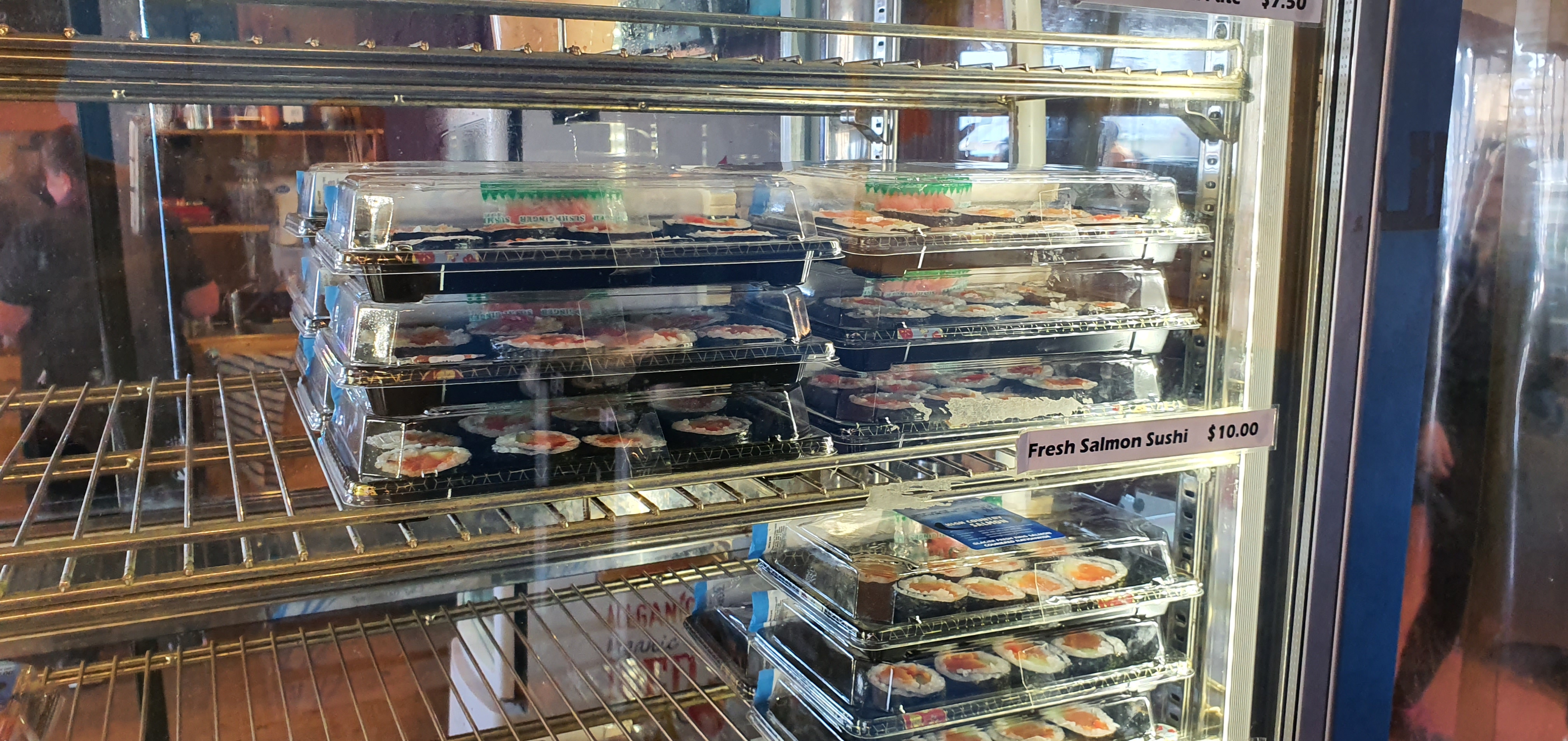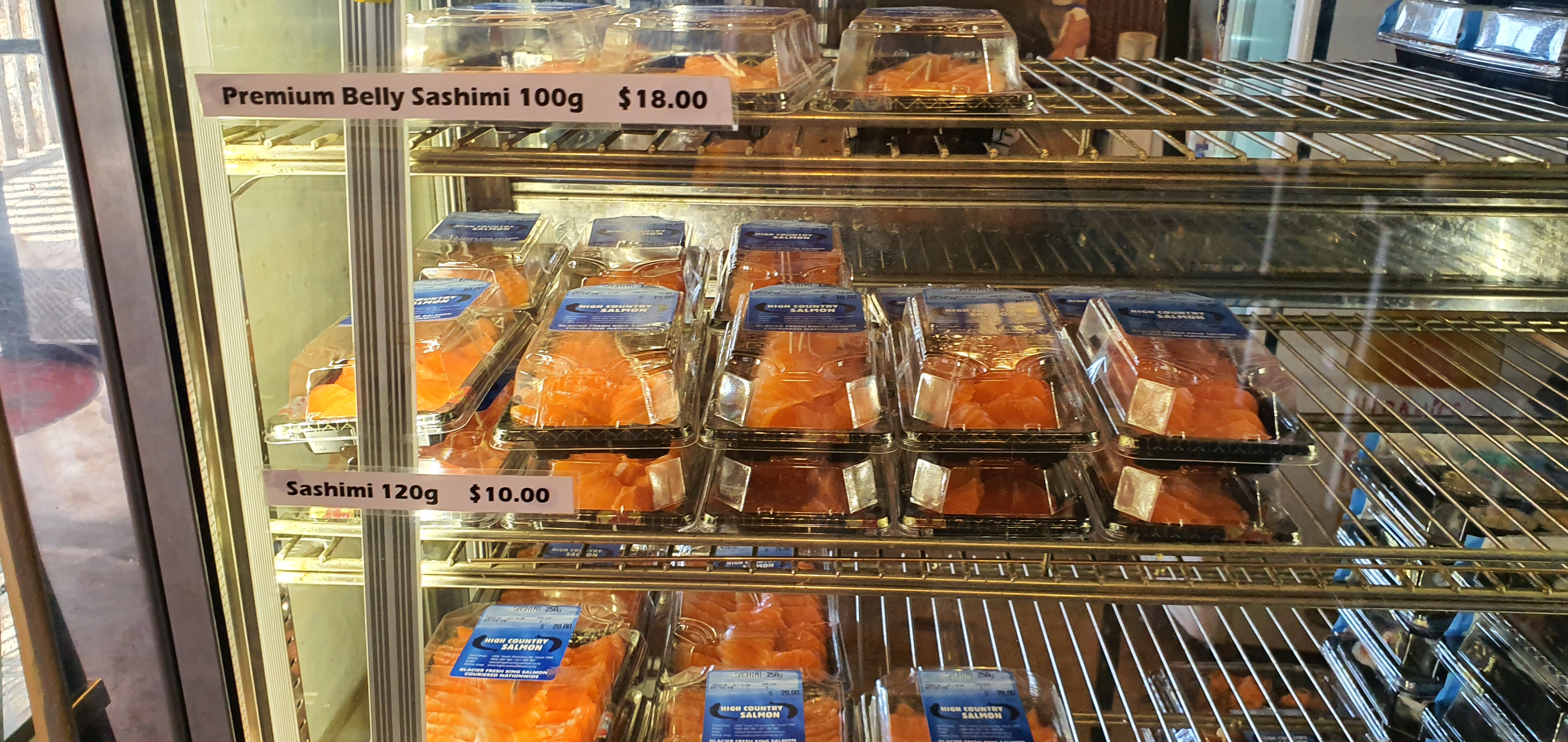 오픈 시간에 거의 맞춰서 도착했지만 사람들이 좀 있는 편이었는데 눈치껏 사람들이 줄 서 있는 곳 뒤로 가서 메뉴판을 한번 살펴봤습니다. 연어는 사시미, 롤 2가지 종류 뿐이었고 먹고싶은 메뉴와 음료를 주문하면 음식을 먼저 주고 음료는 나오면 다시 받으러 가는 시스템이었습니다.