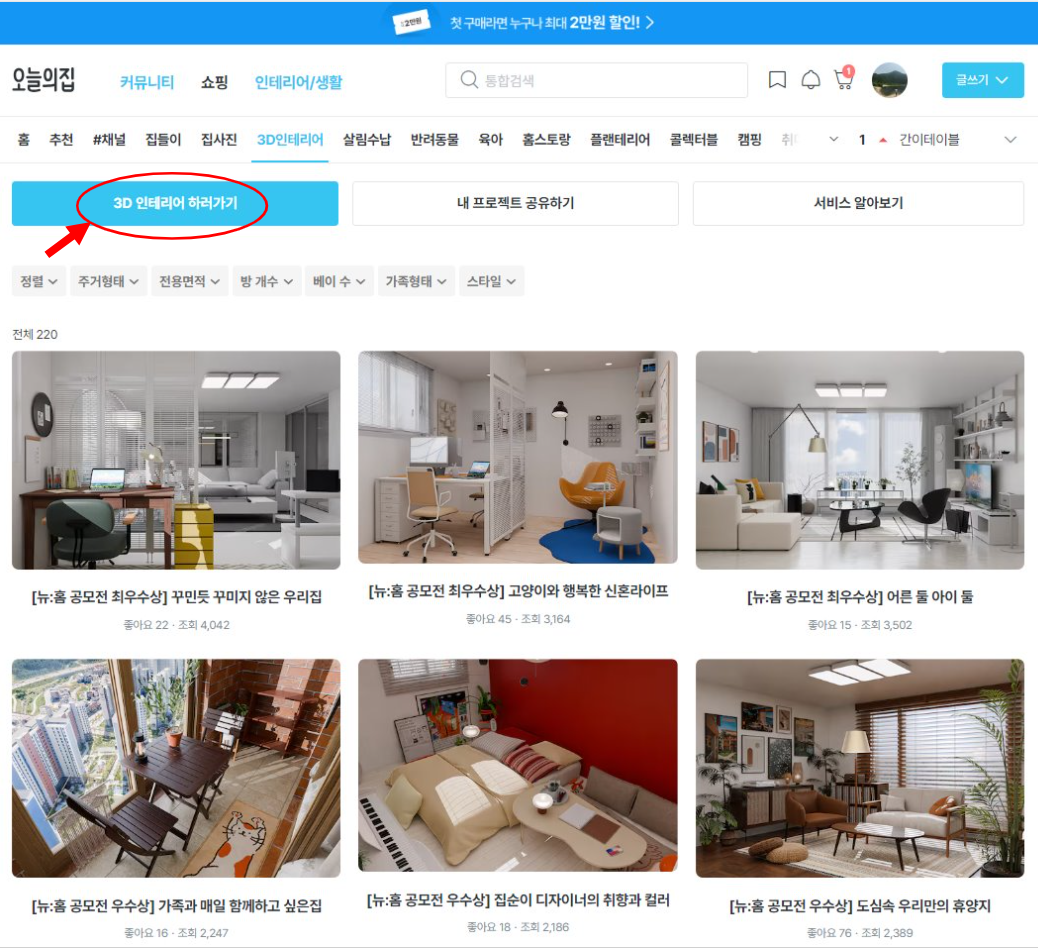 3D 인테리어 메뉴를 클릭하면 다른 사용자들이 작성해둔 3D 인테리어를 볼 수도 있고, 내가 원하는 주거 형태나 면적, 방 개수들로 필터링해서 검색해볼 수도 있는게 오늘의집 3D 인테리어의 장점입니다.