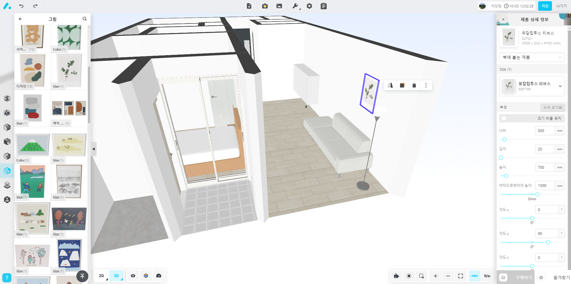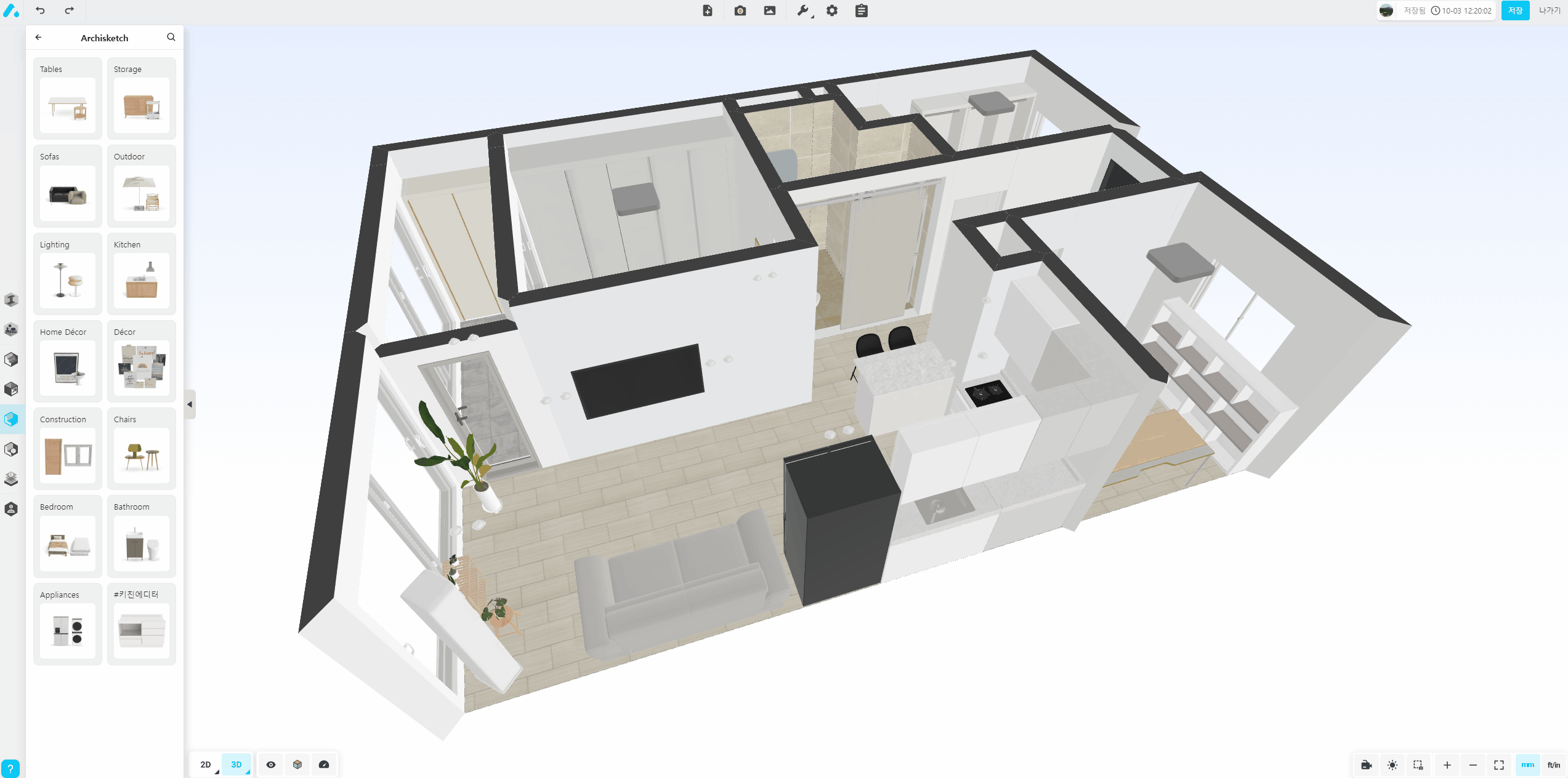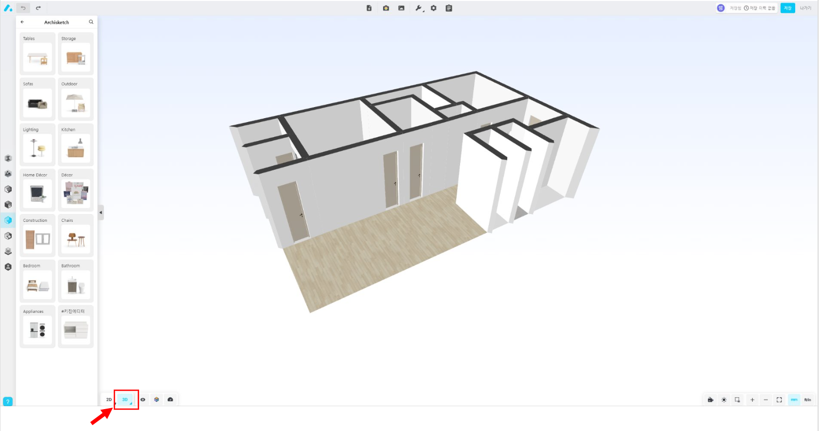 아래 위치한 3D 버튼을 누르면 현재 도면을 3D 로 볼 수 있습니다. 3D로 확인해보면 방마다 문 사이즈가 너무 작게 설정되어있어 현실감이 없는데요, 수정하고싶은 아이템을 클릭하면 우측에 너비가 나오는데 일반적인 문 크기인 800으로 변경해주면 문답게 보이게 됩니다.