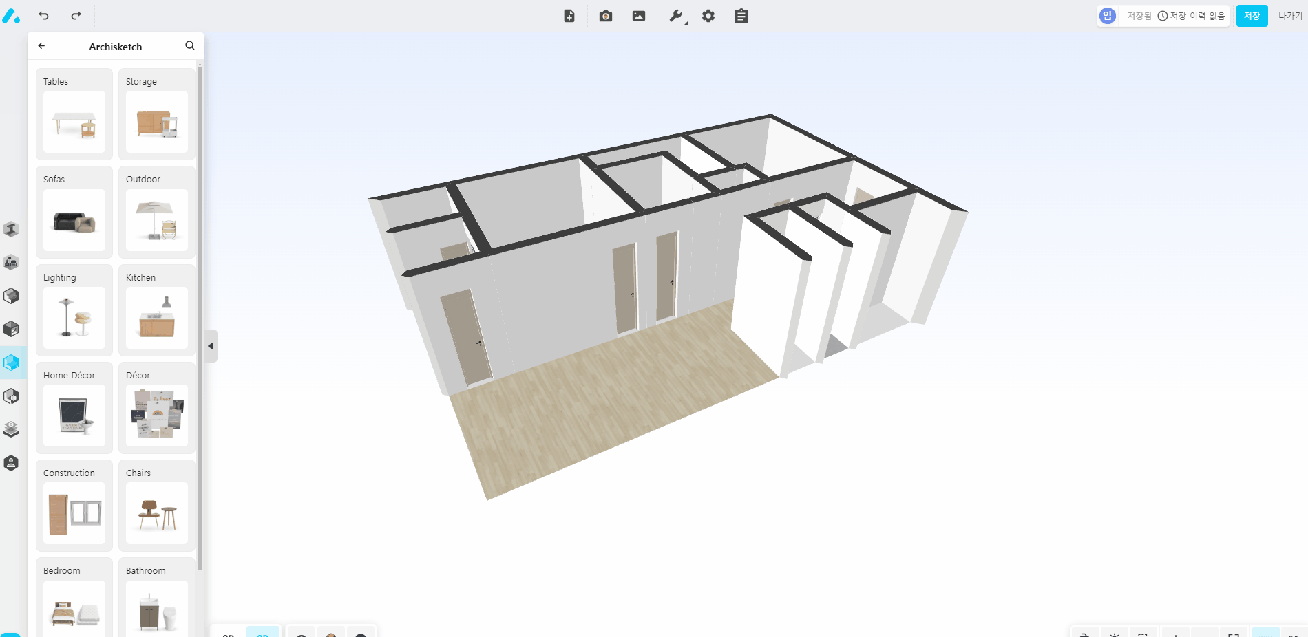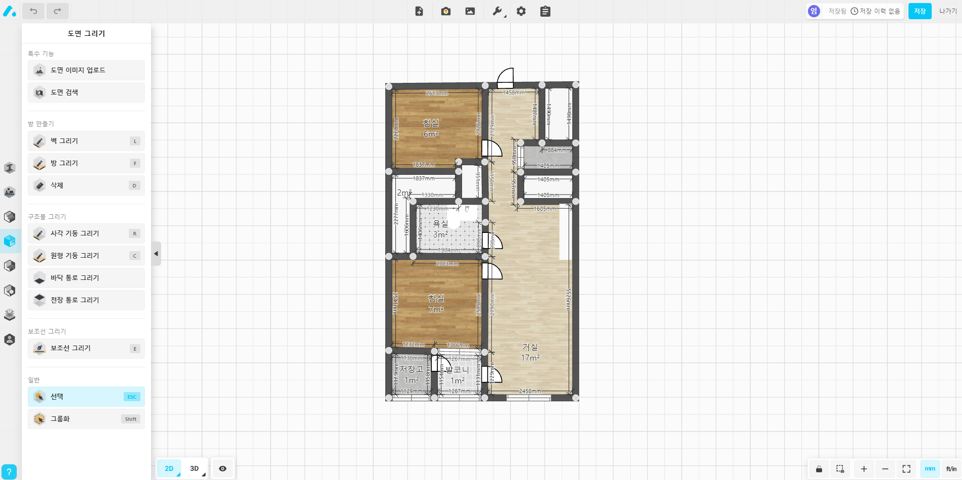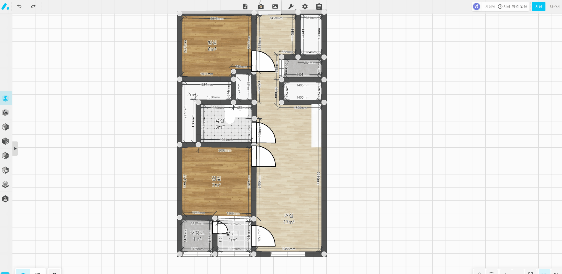 집을 선택하면 이제 인테리어를 해볼 수 있는 기본 2D 도면이 생성됩니다. 아파트, 타입별로 기본 실측된 값을 기반으로 생성했지만 문 크기는 기본 사이즈가 적용되어 있기 때문에 대략적으로 수정은 해주셔야 합니다.