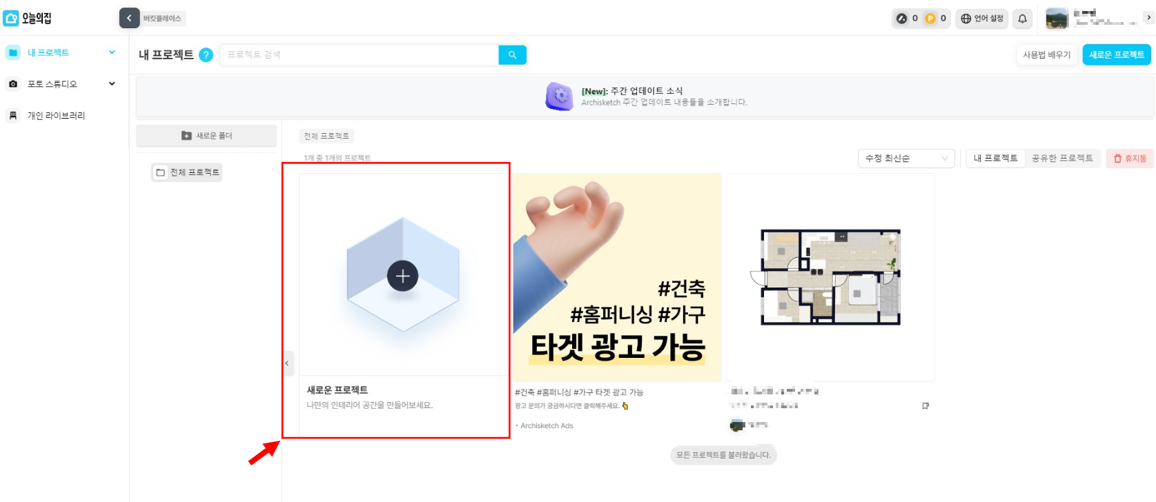 버튼을 누르면 내 프로젝트 공간으로 이동하는데요, 여기서 새로운 프로젝트를 클릭하면 프로젝트를 새로 만들 수 있습니다. 작업 후 프로젝트 저장하게 되면 프로젝트로 바로 이동이 가능합니다.