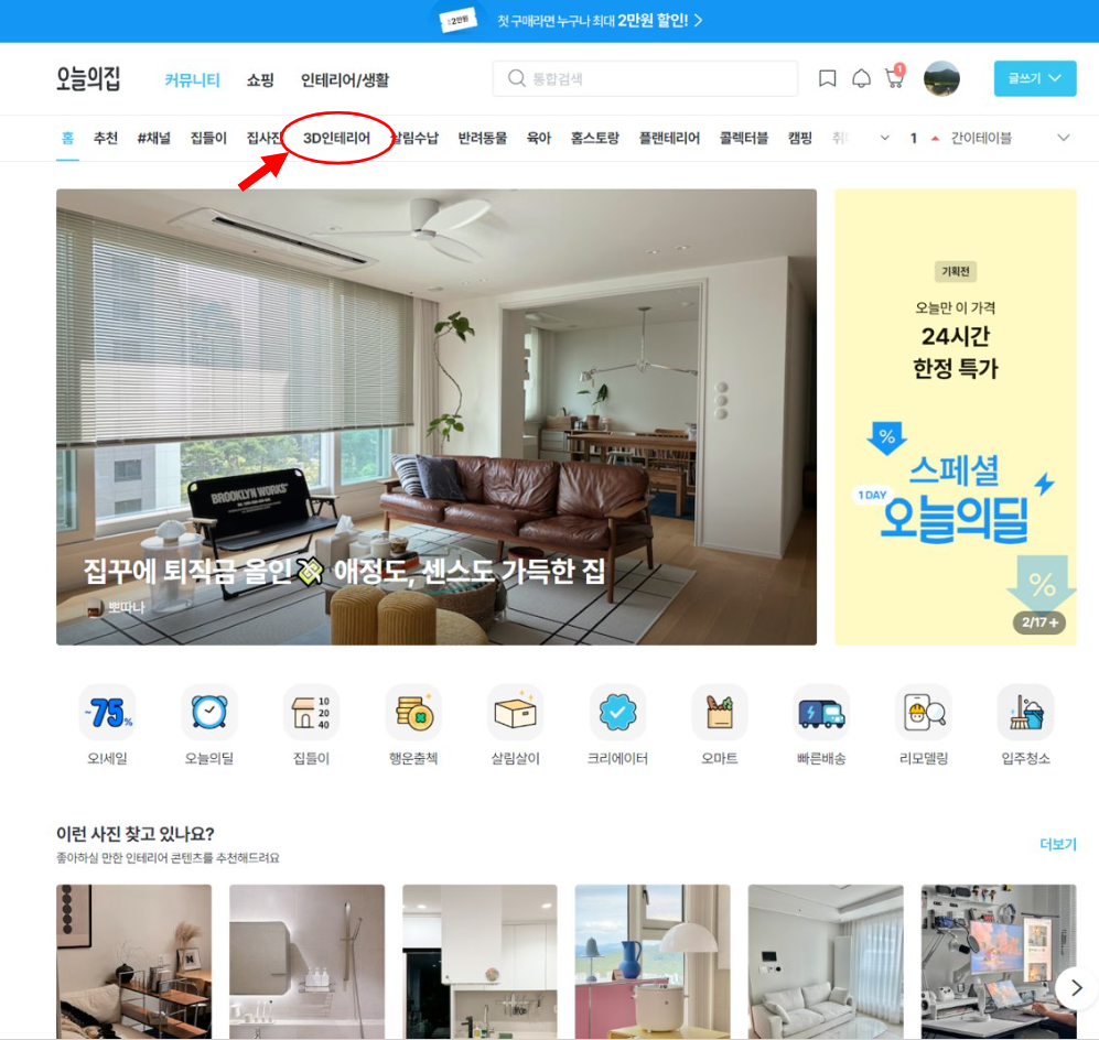 먼저 오늘의집 사이트에 접속하신 뒤 로그인 하시고 상단 3D인테리어 메뉴를 클릭합니다.