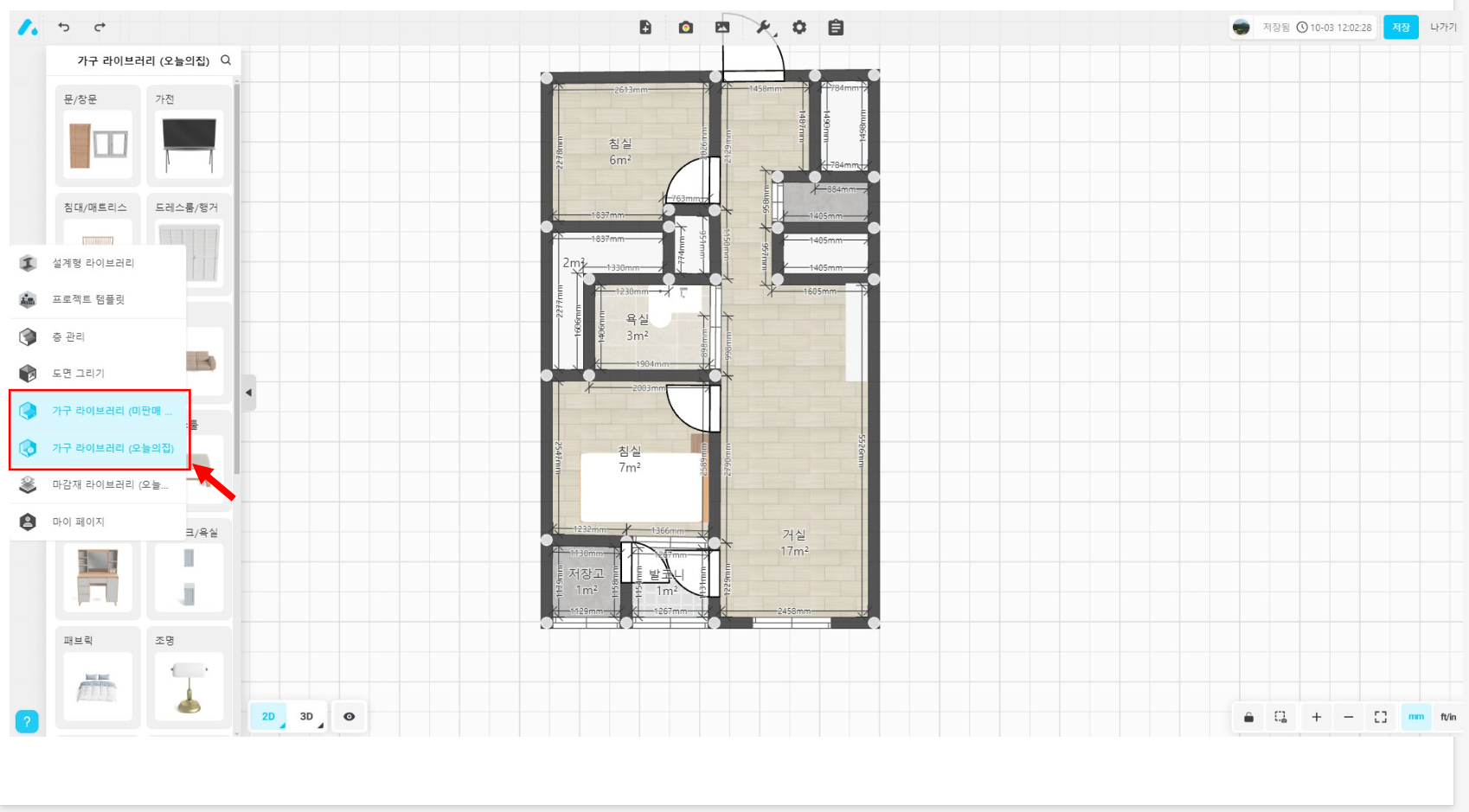 가구 및 가전은 좌측 메뉴에서 가구/라이브러리를 선택하시고 원하는 제품을 검색하거나 선택해서 배치하시면 됩니다. 오늘의집 판매 제품으로 넣으실 수도 있고, 미판매 제품을 적용해보실 수도 있습니다.