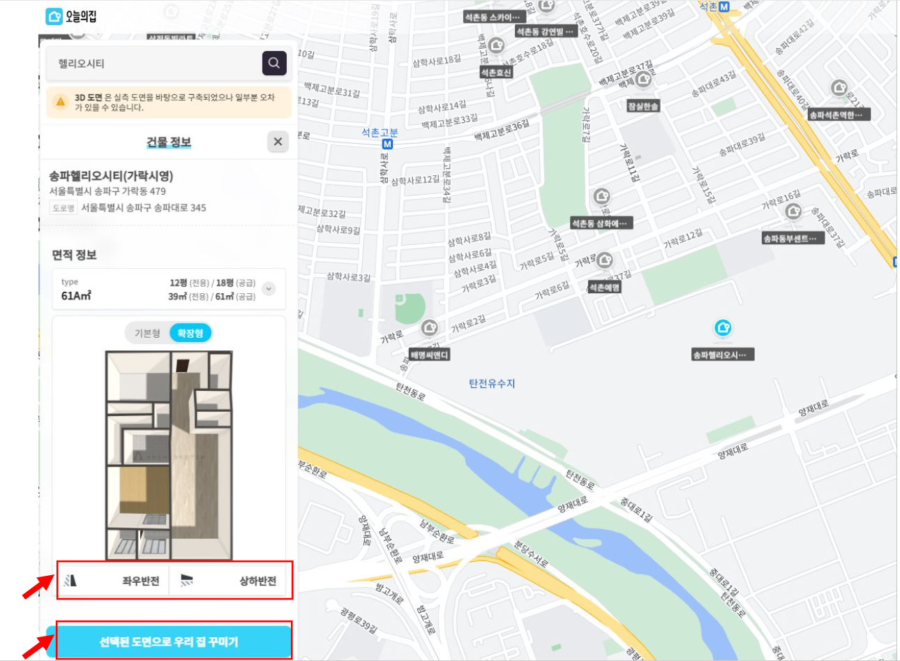 타입 선택할 때 기본형과 확장형을 고를 수 있고, 아파트 동별로 좌우반전이나 상하반전 된 공간도 있는데 오늘의집 3D 인테리어 기능에서는 모든 것들을 지원해주고 있어 편하게 선택할 수 있습니다. 우리집 타입에 맞게 좌우반전 및 상하반전 선택 후 우리집 꾸미기 버튼을 눌러줍니다.