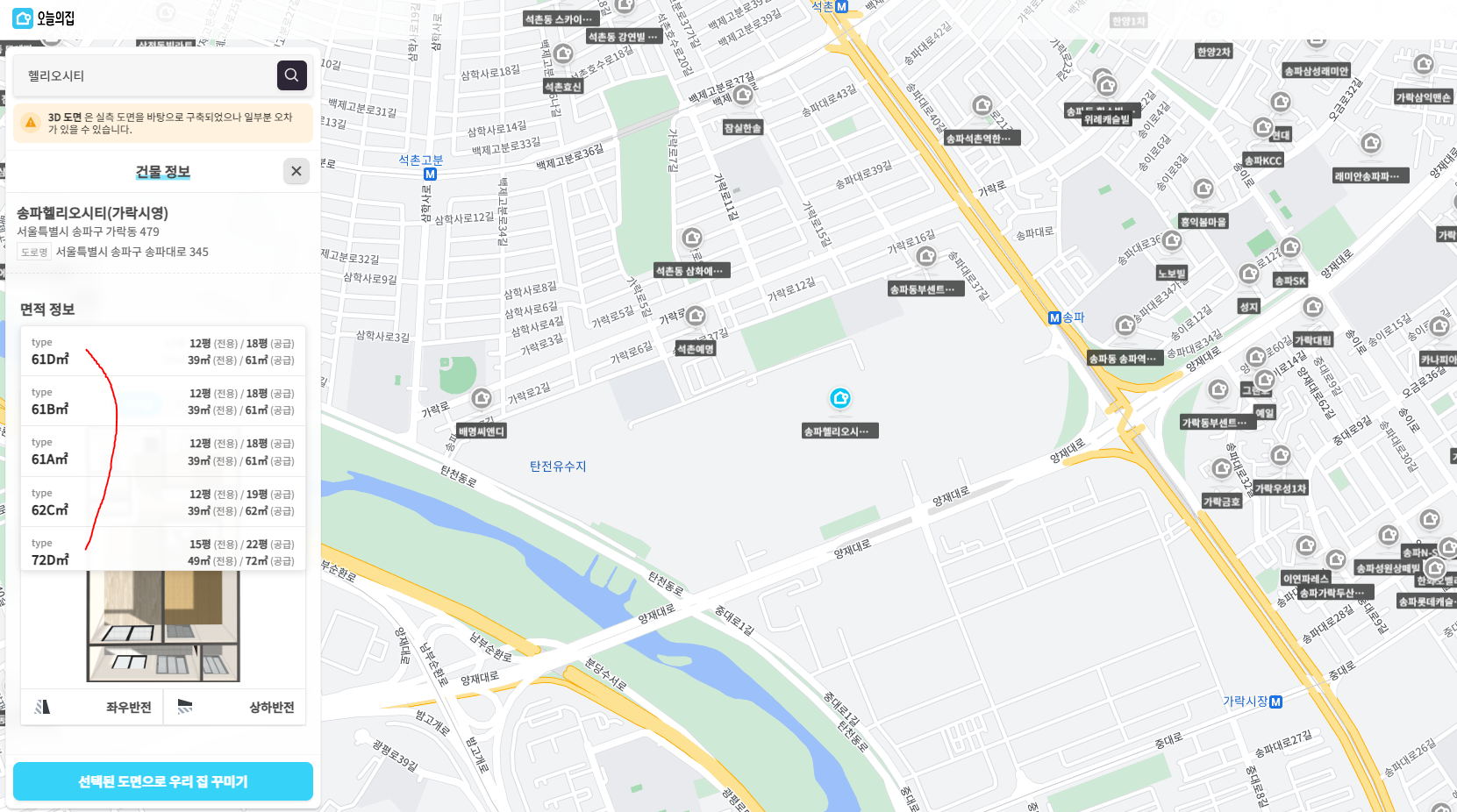 오늘의집 3D 인테리어의 장점은 우리집 검색하기를 통해 아파트의 평면도를 받아올 수 있다는 점입니다. 원룸이나 빌라의 경우 직접 수치를 측정하여 도면을 그려야하지만 아파트의 경우는 우리집 검색하기로 도면을 직접 그릴 수 있어 유용합니다.