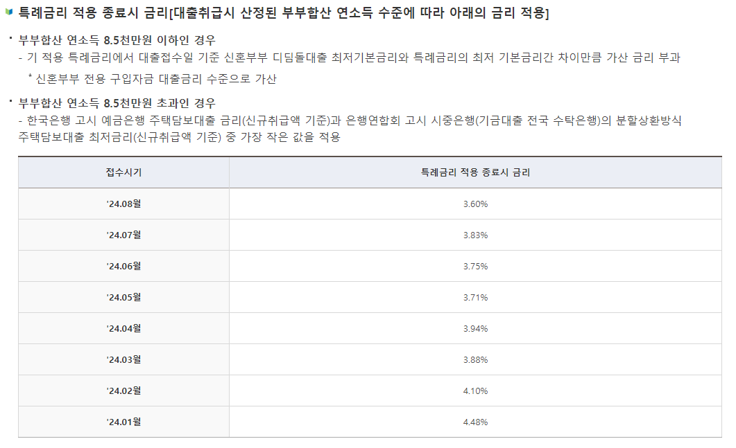 부부합산 연소득이 8.5천 초과인 경우에는 대출취급시 금리 기준에 따라 특례금리 적용 종료 시 금리가 정해지기 때문에, 접수시기에 따라 특례금리 적용 종료 시 금리가 달라집니다. 대출 접수 시점에 따라 특례금리가 달라진다는 점은 아쉬운 점으로 보입니다.