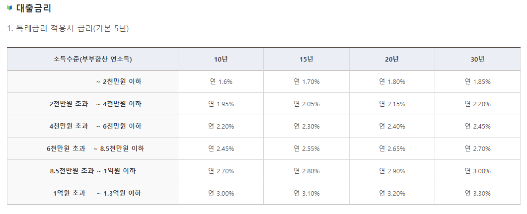 다만 이 금리는 초반 5년에 대한 고정금리이고, 5년 이후에는 특례금리가 종료되어 일반 금리가 적용되게 됩니다. 적용 종료 후 금리는 "대출취급시 산정된 부부합산 연소득" 수준에 따라 금리가 결정됩니다. 대출 실행 시 부부합산 연소득이 8.5천만원 이하였다면 5년간 소득이 상승하여 8.5천이 넘었더라도 8.5천 이하의 기준으로 금리가 산정됩니다.