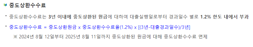대출 실행 후 3년 이내 중도상환한 원금에 대해 일별 1.2% 한도 내에서 부과한다고 되어있습니다. 다만 24년 8월 12일 ~ 25년 8월 11일까지의 중도상환된 원금에 대해서는 중도상환수수료가 면제된다고 되어있는데, 이런 예외조건들이 많아 복잡하게 느껴지는 것 같습니다.