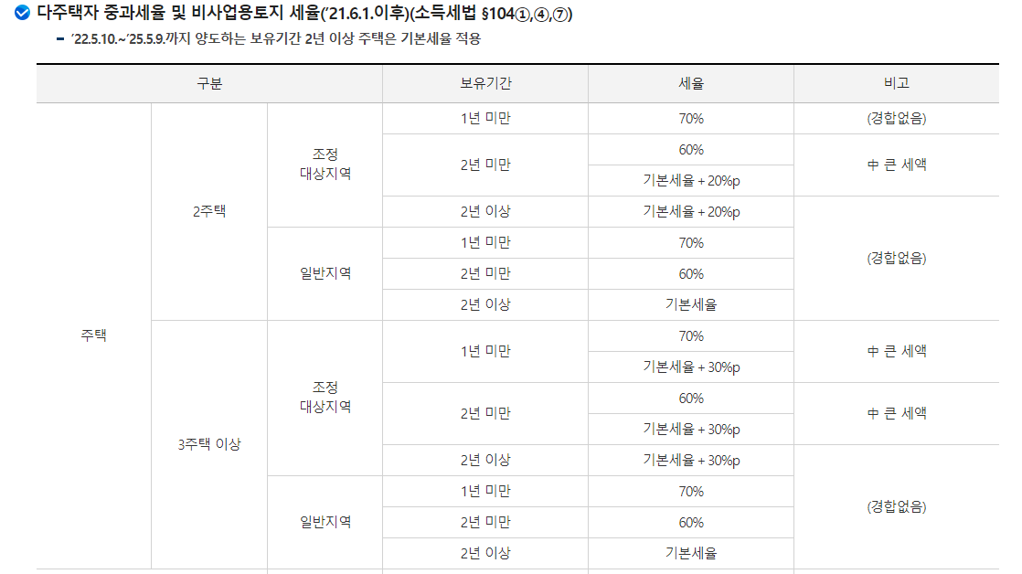 또 정부는 주택 거래가 너무 활성화 되지 않는 경우 세수 확보의 문제가 있기 때문에 22년 5월 10일 ~ 25년 5월 9일 까지 다주택자가 2년 이상 주택 보유 후 양도 시 중과세율을 적용하지 않고 기본세율만 적용한다고 발표하였습니다.