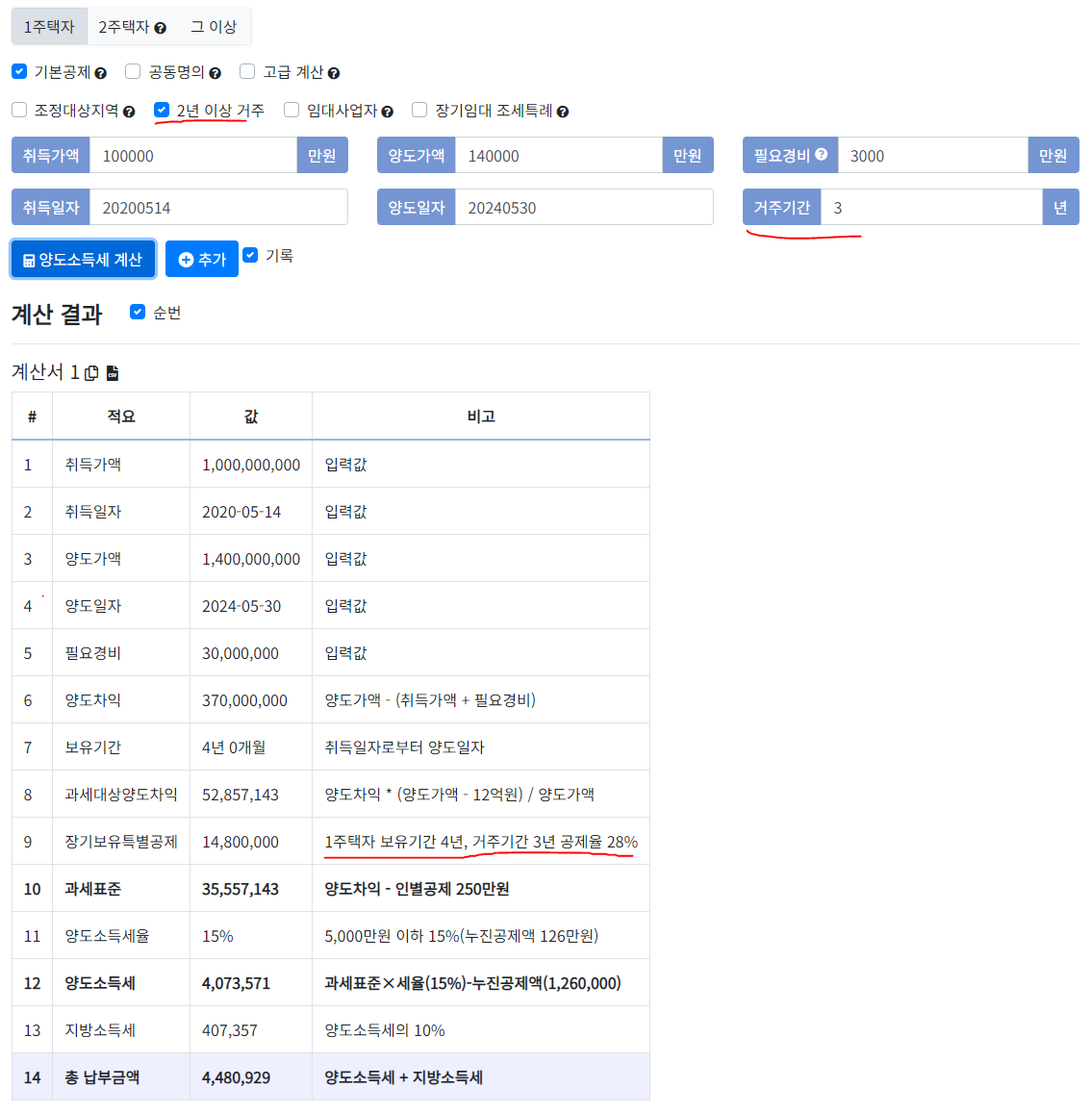 실거주 3년을 추가하니 장기보유 특별공제에 거주기간 3년에 대한 공제율 28%가 추가되었습니다!