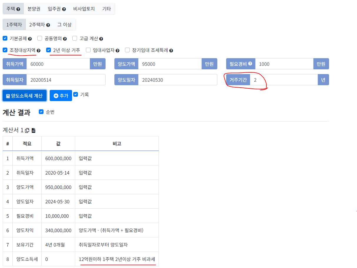 위 조건과 동일하지만 조정대상지역에 실거주 기간 없는 상태로 계산을 해보겠습니다.