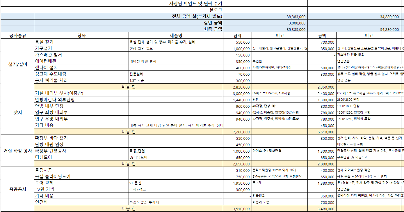 저희도 총 4군데에서 상담을 받았고 이 중 고민되는 두 곳의 상세 견적을 비교해봤습니다.