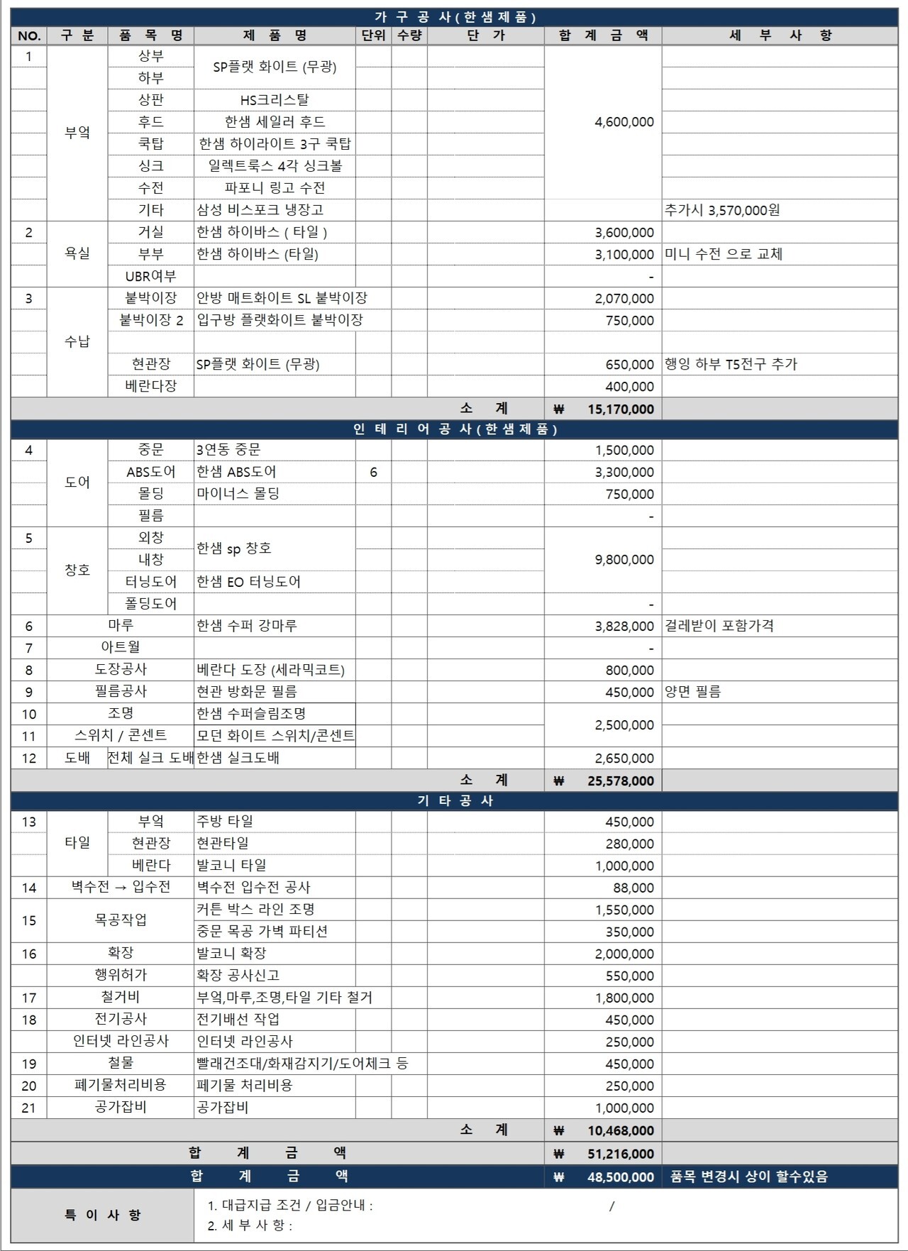 각 공정별로 정확한 제품과 정확한 가격이 포함되어 있는지에 대한 확인이 필요합니다.