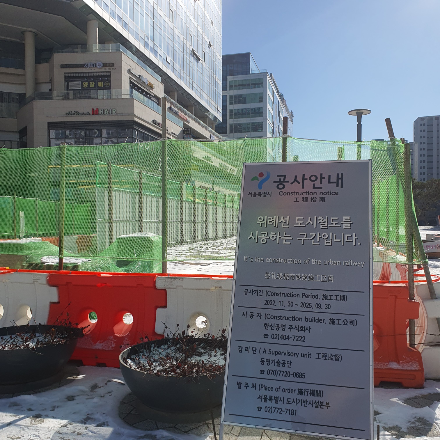 또 광장 가운데에는 위례선 도시철도(트램)이 공사중이라 펜스가 둘러져 있는 것이 보였습니다. 착공까지만 해도 상당한 시간이 소요되는데 착공을 시작했다는 점은 특별한 이슈만 없다면 공사가 쭉 진행될 것으로 보입니다.