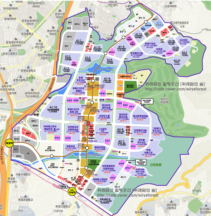 특이하게 위례신도시는 서울시 송파구 장지동/거여동 일부, 경기도 성남시 수정구 창곡동/복정동의 일부, 하남시 학암동 일대에 조성되었는데 길 하나 차이로 행정구역이 바뀌는 신기한 동네입니다. 생활권은 모두 공유하지만 행정구역이 다르기 때문에 길 건너의 아파트라도 학교는 다른 곳으로 배정받습니다. 수용인구는 42,910 세대 107,275명으로 계획되었으며 아직 북위례 일부는 입주를 진행중입니다.