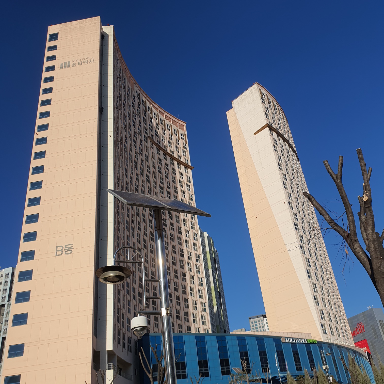스타필드에서 다시 송파구 쪽으로 넘어오다보니 구조가 특이해보이는 아파트가 보였습니다. 아파트 벽면에는 송파학사 라고 적혀있었고 아래 상권에는 밀토피아 라고 적혀있었는데 찾아보니 군인 임대 아파트였습니다. 구조와 외부 벽면 색이 특이해서 기억에 남는 아파트였습니다.