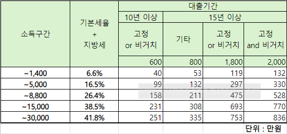 공제 금액은 상환 기간, 거치 여부, 고정금리 여부에 따라 한도가 달라지게 됩니다.